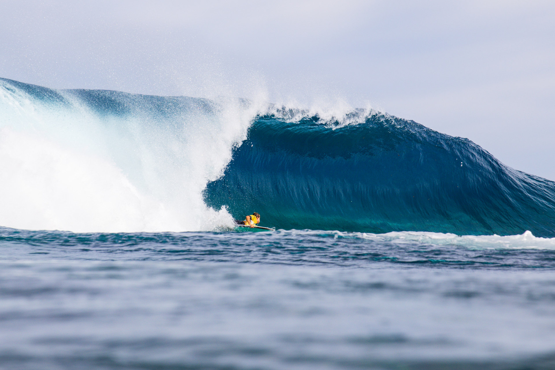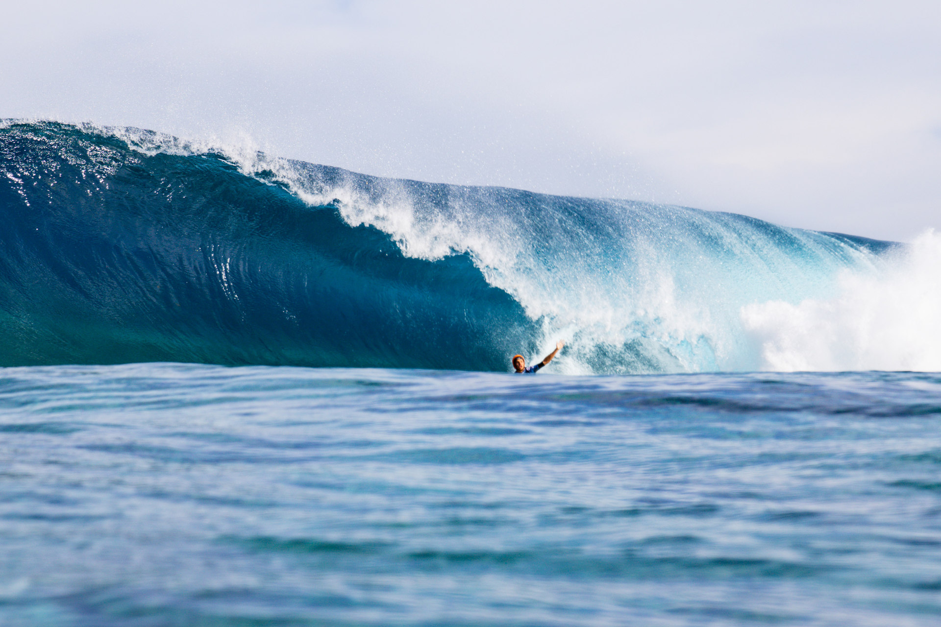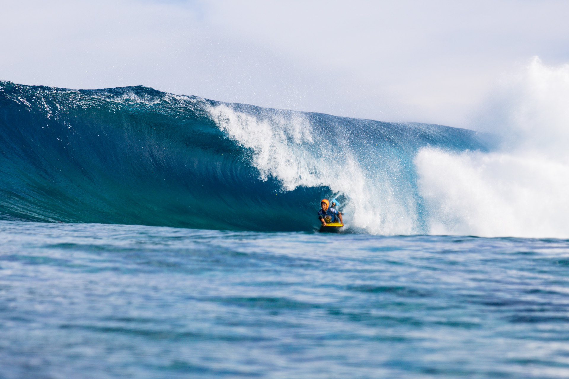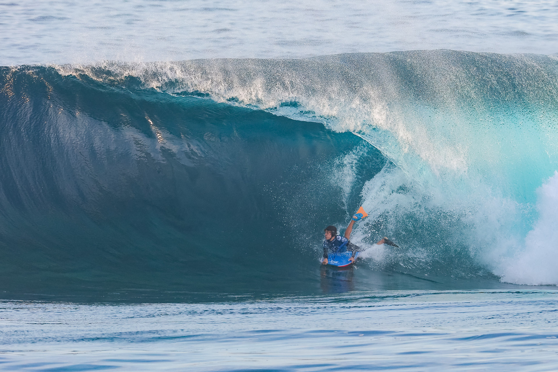 Second chance for the juniors, and what a setting — perfect waves, blue skies, and heavy barrels.